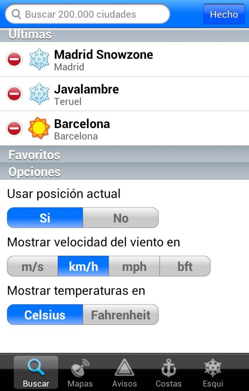 Para terminar, Eltiempo.es también te informa de las costas y pistas de esquí. En el primer caso, sabrás la velocidad y dirección del viento, para saber si podrás o no navegar. En cuanto a las pistas de esquí, Eltiempo.es te dirá las pistas abiertas y cerradas y la calidad de la nieve.